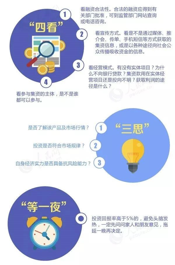 遇到投資集資類(lèi)宣傳,一定要避免頭腦發(fā)熱,先征求家人和朋友意見(jiàn),拖延一晚再?zèng)Q定,不要被高利誘惑盲目投資。
