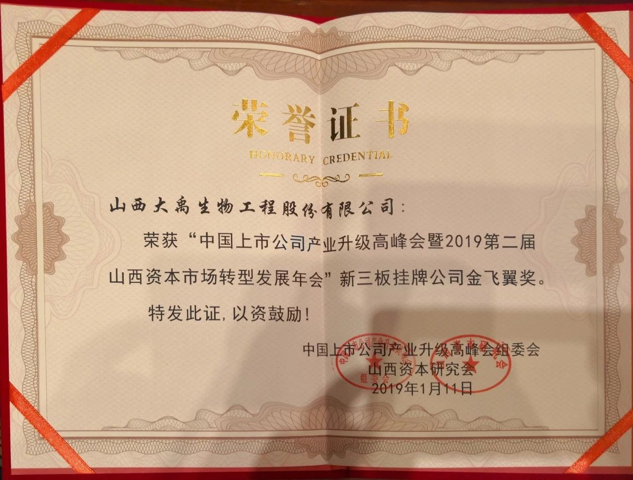 大禹生物榮獲新三板掛牌公司“金飛翼獎”