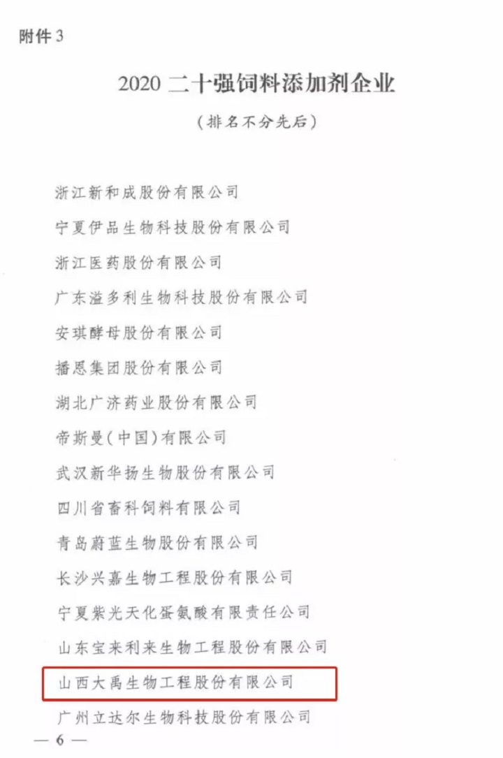 【喜訊】大禹生物榮獲2020全國(guó)二十強(qiáng)飼料添加劑企業(yè)稱號(hào)