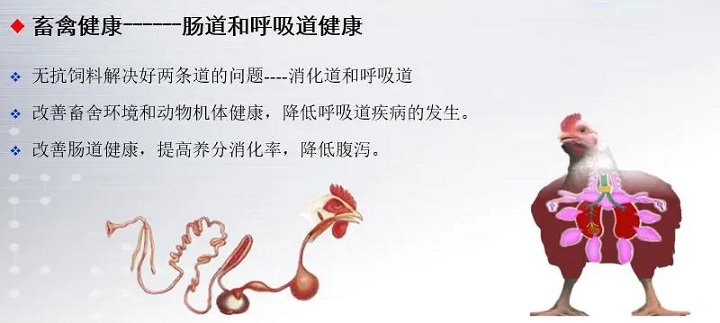 畜禽健康,關(guān)鍵點在于維持腸道和呼吸道健康。健康的呼吸道能夠完成正常的獲取O2和CO2的生理過程,通過維持良好的畜舍環(huán)境、降低有害氣體濃度(氨氣、硫化氫和二氧化碳)和粉塵顆粒物的數(shù)量、維持動物機體健康、增加抵抗力和黏膜修復(fù)能力來保持呼吸道健康。腸道通過腸道內(nèi)維持健康自然的微生物群體、釋放抗體、阻止病原菌穿過物理環(huán)境、食物在消化系統(tǒng)內(nèi)的移動和產(chǎn)生黏膜蛋白屏障免于受病原菌的侵害,腸道健康的核心問題是腸道形態(tài)結(jié)構(gòu),不同腸段的長度、容積以及絨毛、刷狀緣的生理狀態(tài)和黏蛋白層的完整性。